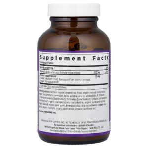 Meios de fermentação (farinha de soja orgânica, casca de laranja orgânica em pó, Saccharomyces cerevisiae orgânico, bactérias do ácido lático vitamina L. acidophilus, B. bifidum, L rhamnosus’, papaína ³desativada93;, bromelaína “desativada”), maltodextrina orgânica; Menos de 2% de: revestimento orgânico (maltodextrina orgânica, lecitina de girassol orgânico, óleo de palma orgânica, goma guar orgânica), silica hidratada, mistura de extrato de arroz (extrato de arroz orgânico, cascas de arroz orgânico, goma-arábica orgânica, óleo de girassol orgânico).