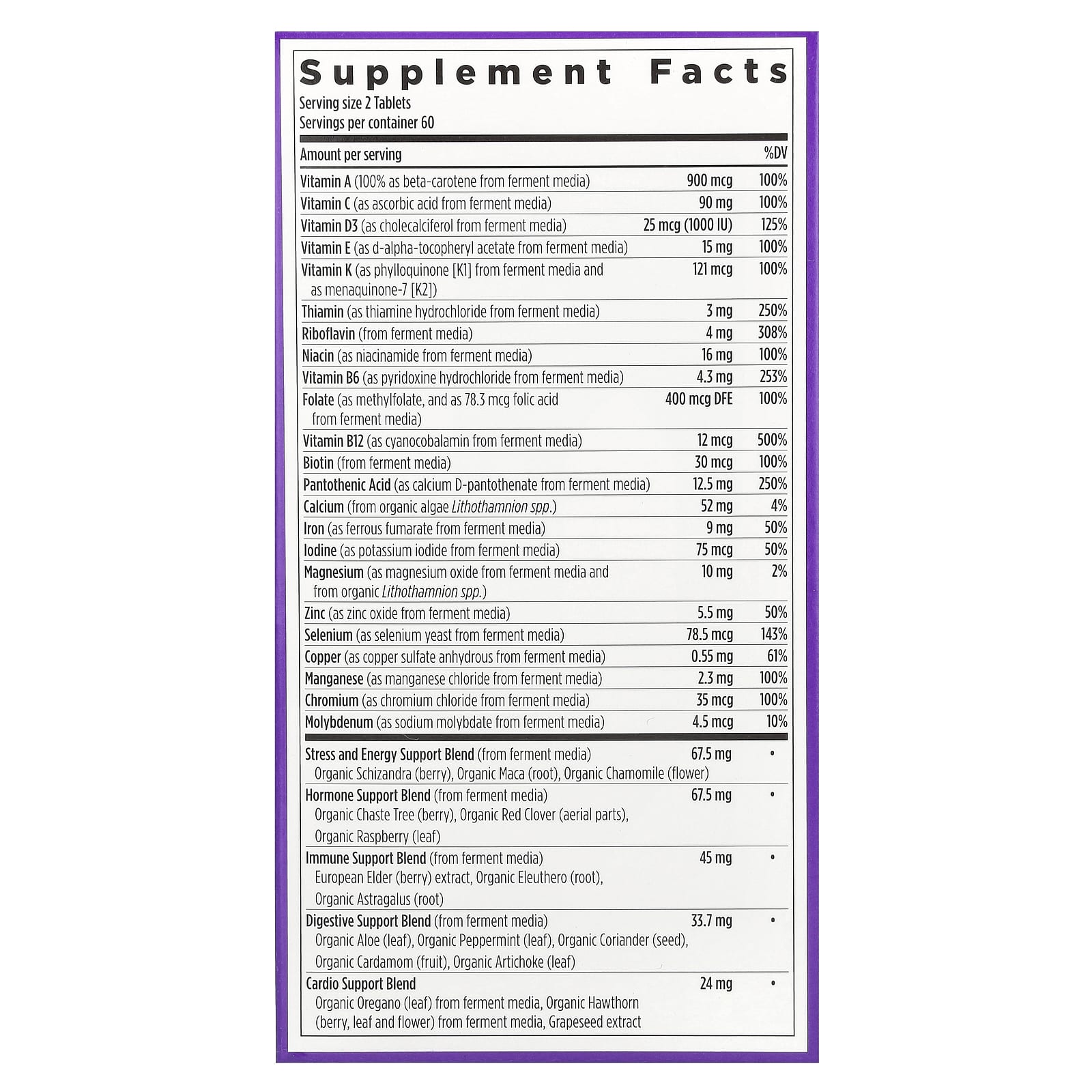 Auxílio completo para a saúde geral das mulheres e benefícios específicos do sistema, com nutrientes para coração, cérebro, visão, saúde óssea e das mamas, alívio do estresse e digestão saudável, embalados em apenas 2 comprimidos por dia.