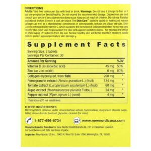Mantenha fora do alcance de crianças. Não tome caso esteja grávida ou amamentando. Não tome se tiver alergia a peixe. Não utilize caso a embalagem blister (camada interna) esteja aberta ou violada. Armazene em local seco e arejado. Não é recomendado exceder esta dosagem. O comprimido SkinCare tem base de colágeno marinho hidrolisado e vitamina C padronizada e otimizada que ajuda na formação de colágeno, importante para uma pele normal e saudável. Skin Care ajuda as células contra o estresse oxidativo – por exemplo, o efeito da radiação UV do sol que favorece o envelhecimento. A pele normal e saudável manterá melhor a umidade nas células para proteger contra o envelhecimento precoce da pele.