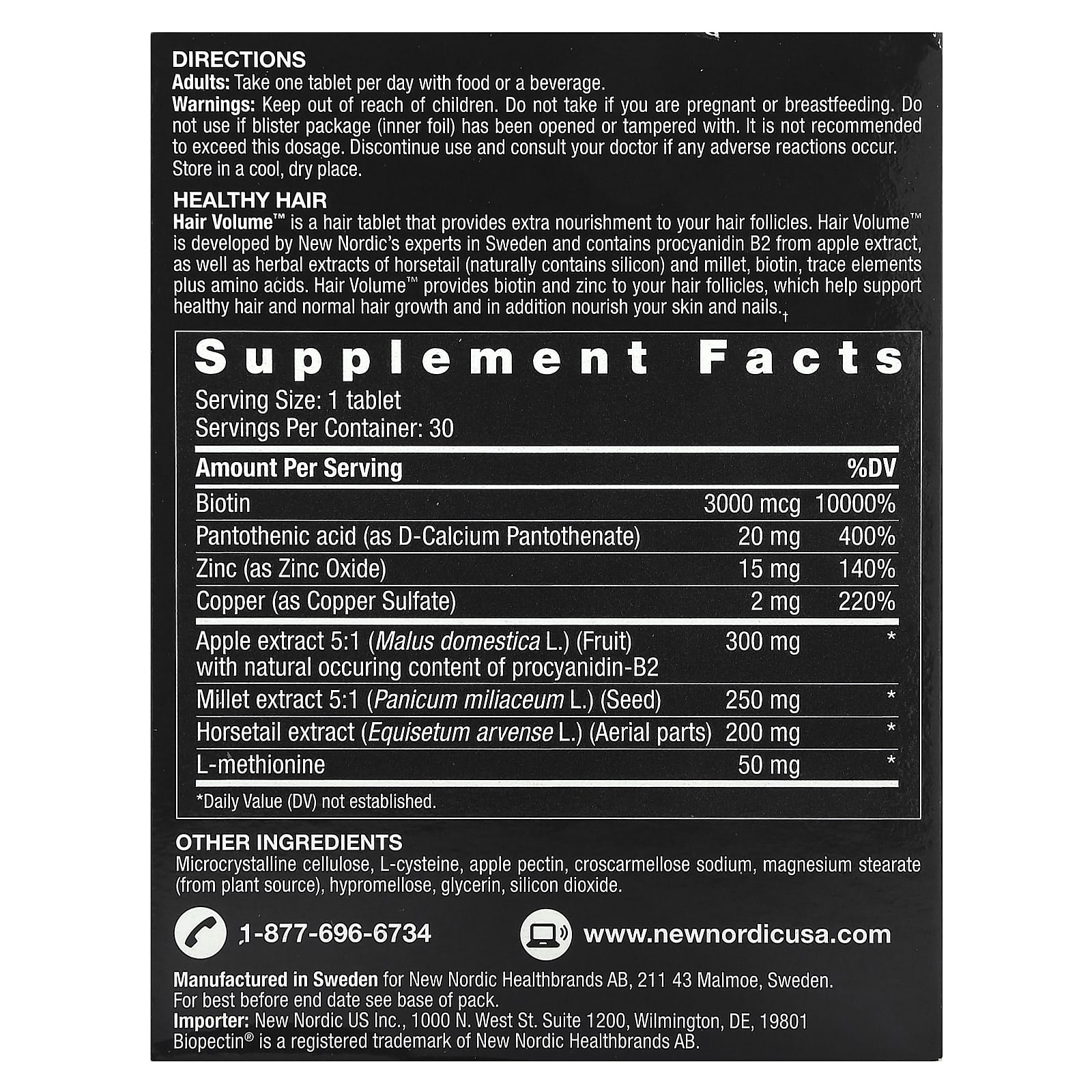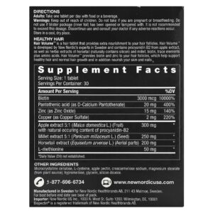 Hair Volume™ é um comprimido para os cabelos que fornece nutrição extra aos folículos capilares. Hair Volume™ foi desenvolvido por especialistas da New Nordic na Suécia e contém procianidina B2 do extrato de maçã, bem como extratos de ervas de cavalinha e painço, biotina, oligoelementos e aminoácidos. Hair Volume™ fornece biotina e zinco aos folículos capilares, o que ajuda a manter o cabelo saudável e o crescimento normal, além de nutrir a pele e as unhas. O comprimido também contém cobre, que ajuda a manter a produção normal do pigmento melanina do cabelo, dando cor ao cabelo que ficaria grisalho sem esse pigmento.