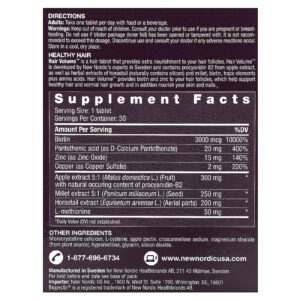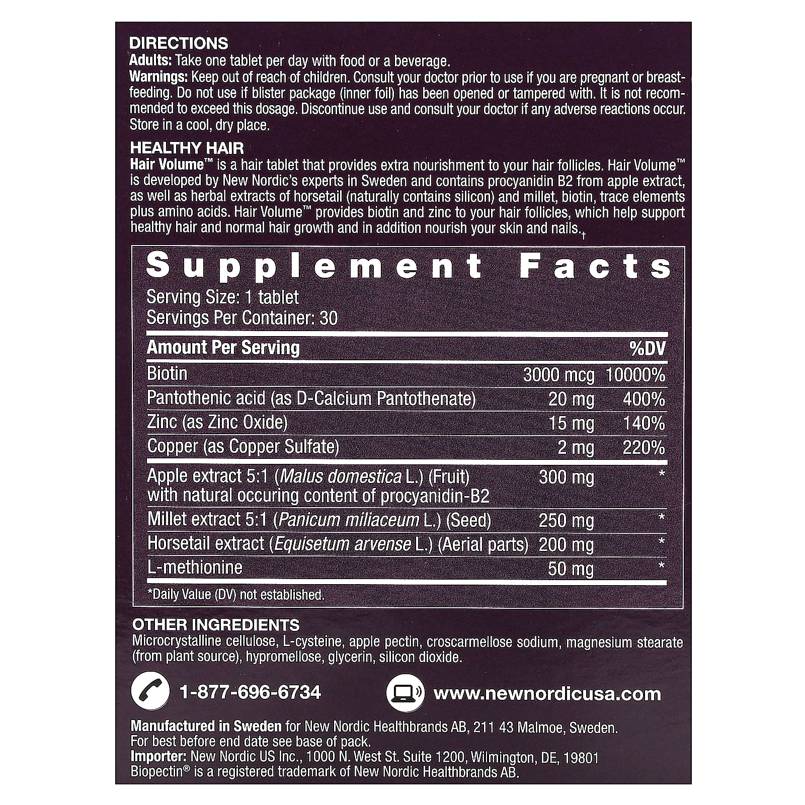 Hair Volume™ é um comprimido para os cabelos que fornece nutrição extra aos folículos capilares. Hair Volume™ foi desenvolvido por especialistas da New Nordic na Suécia e contém procianidina B2 do extrato de maçã, bem como extratos de ervas de cavalinha e painço, biotina, oligoelementos e aminoácidos. Hair Volume ™ fornece biotina e zinco aos folículos capilares, o que ajuda a manter o crescimento capilar saudável e normal e, além disso, nutre a pele e as unhas.