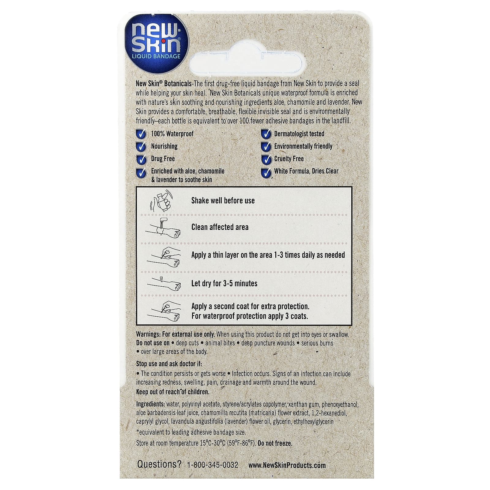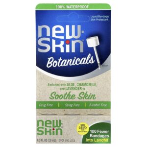New Skin® Botanicals – O primeiro curativo líquido sem medicamentos da New Skin a selar a pele ao mesmo tempo que ajuda a curar sua pele. A fórmula à prova d’água exclusiva da New Skin Botanicals é enriquecida com ingredientes naturais calmantes e nutritivos para a pele, aloe, camomila e lavanda. A New Skin fornece um lacre invisível confortável, respirável, flexível e é ecologicamente correto: cada frasco equivale a mais de 100 curativos adesivo a menos no aterro.