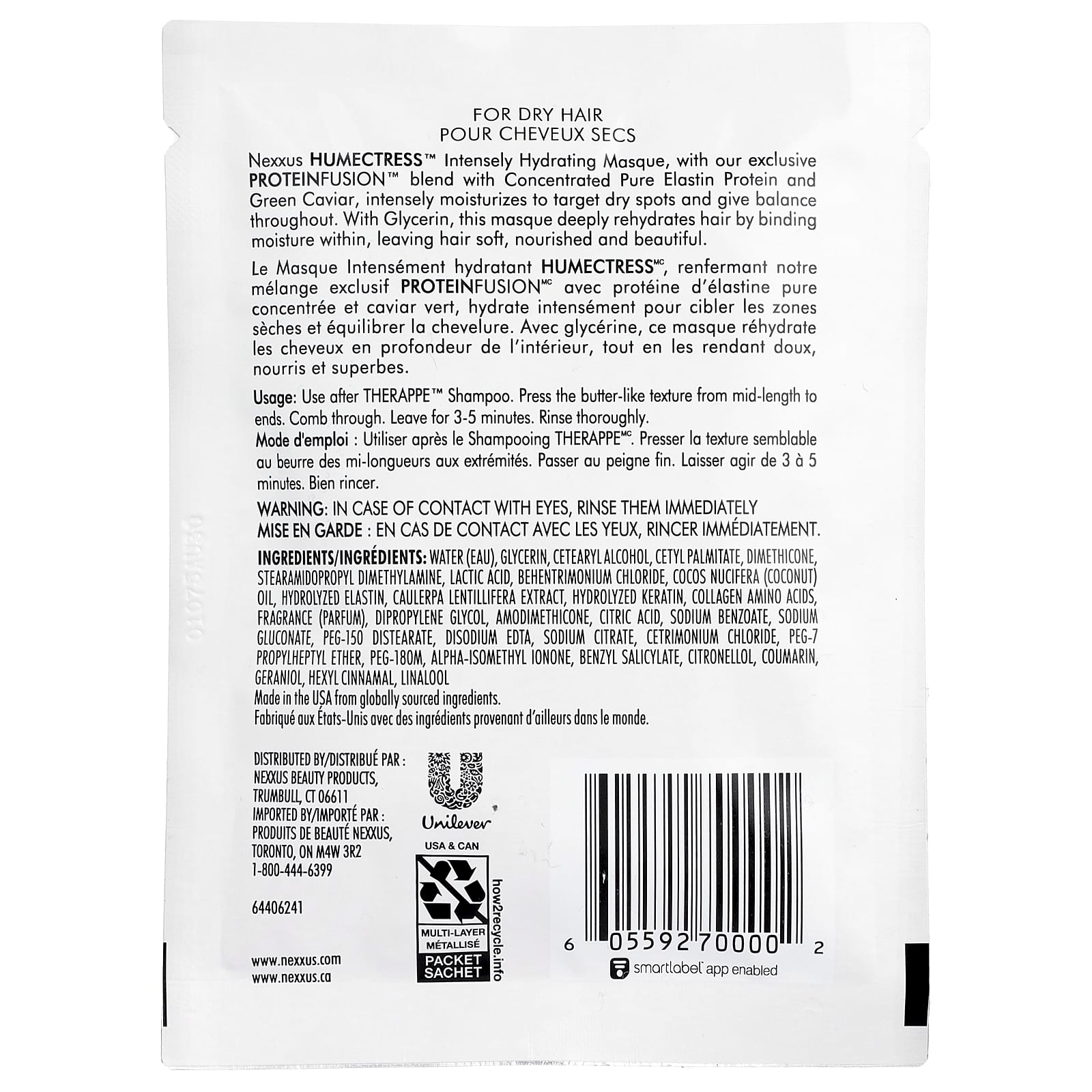 A máscara capilar de hidratação intensiva Humectress, que apresenta nossa combinação exclusiva ProteinFusion da proteína elastina pura concentrada e alga verde, hidrata intensamente para alcançar pontos secos e deixar os cabelos equilibrados. Contendo glicerina, esta máscara reidrata profundamente o cabelo ao hidratar seu interior, deixando o cabelo macio, nutrido e bonito.
