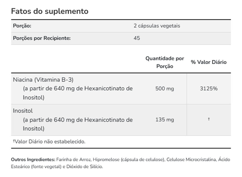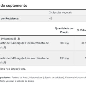 Cada cápsula contém 250mg de niacina em uma fórmula projetada para evitar o rubor. Os ingredientes foram cuidadosamente selecionados para oferecer suporte completo e eficiente. Validade longa