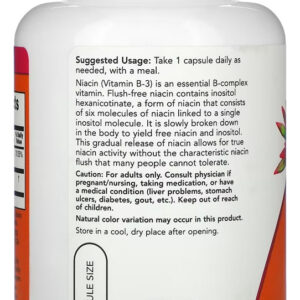 Niacina 500 mg Força Dupla Now Foods 90 Veg Caps / No Brasil   Disponível em cápsulas de 500mg que podem ser facilmente ingeridas e absorvidas, a Niacina  (Vitamina B3) da Now Foods é uma vitamina essencial do complexo B que contém hexanicotinato de inositol, uma forma de niacina que consiste em seis moléculas de niacina ligadas a uma única molécula de inositol, que é lentamente decomposto no corpo para produzir niacina e inositol livres. Esta liberação gradual de niacina permite a verdadeira atividade de niacina sem o característico rubor de niacina que muitas pessoas podem tolerar.   Outros Ingredientes: Hipromelose (cápsula de celulose), Ácido Esteárico (fonte vegetal), Farinha de Arroz e Dióxido de Silício.   Fabricado sem ingredientes de trigo, glúten, soja, leite, ovo, peixe, marisco ou nozes.   Cuidados: Apenas para adultos. Busque orientação antes de usar este produto se estiver grávida ou amamentando. Mantenha fora do alcance de crianças.   Armazenamento: Pode ocorrer variação de cor natural neste produto. Armazenar em local fresco e seco após a abertura.   Dimensões: 6,9 x 6,9 x 11,4 cm Peso: 0,128 Itens inclusos: 1x Frasco com 90 Veg Cáps.   VIDE VALIDADE
