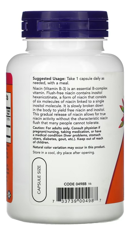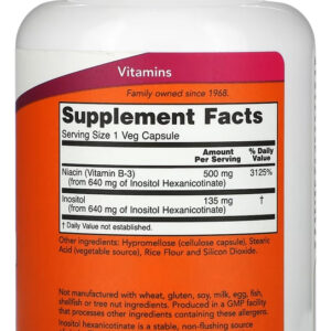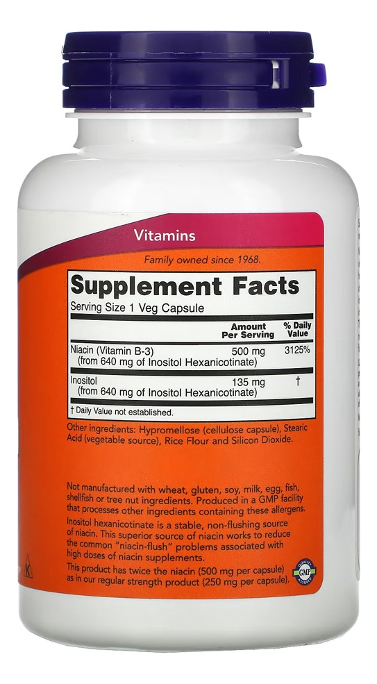 Niacina 500 mg Força Dupla Now Foods 90 Veg Caps / No Brasil   Disponível em cápsulas de 500mg que podem ser facilmente ingeridas e absorvidas, a Niacina  (Vitamina B3) da Now Foods é uma vitamina essencial do complexo B que contém hexanicotinato de inositol, uma forma de niacina que consiste em seis moléculas de niacina ligadas a uma única molécula de inositol, que é lentamente decomposto no corpo para produzir niacina e inositol livres. Esta liberação gradual de niacina permite a verdadeira atividade de niacina sem o característico rubor de niacina que muitas pessoas podem tolerar.   Outros Ingredientes: Hipromelose (cápsula de celulose), Ácido Esteárico (fonte vegetal), Farinha de Arroz e Dióxido de Silício.   Fabricado sem ingredientes de trigo, glúten, soja, leite, ovo, peixe, marisco ou nozes.   Cuidados: Apenas para adultos. Busque orientação antes de usar este produto se estiver grávida ou amamentando. Mantenha fora do alcance de crianças.   Armazenamento: Pode ocorrer variação de cor natural neste produto. Armazenar em local fresco e seco após a abertura.   Dimensões: 6,9 x 6,9 x 11,4 cm Peso: 0,128 Itens inclusos: 1x Frasco com 90 Veg Cáps.   VIDE VALIDADE