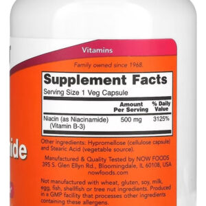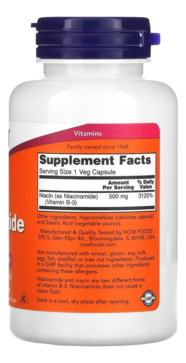 A Niacinamida 500mg Now Foods, também conhecida como vitamina B3, é uma forma de Niacina solúvel em água. É um derivado da niacina que não provoca o rubor comum em altas doses de niacina. A Niacinamida é convertida em formas bioativas da Niacina, NAD+, NADH, NADP e NADPH, que são cofatores cruciais na produção de energia celular e essenciais para a manutenção da estabilidade do DNA.