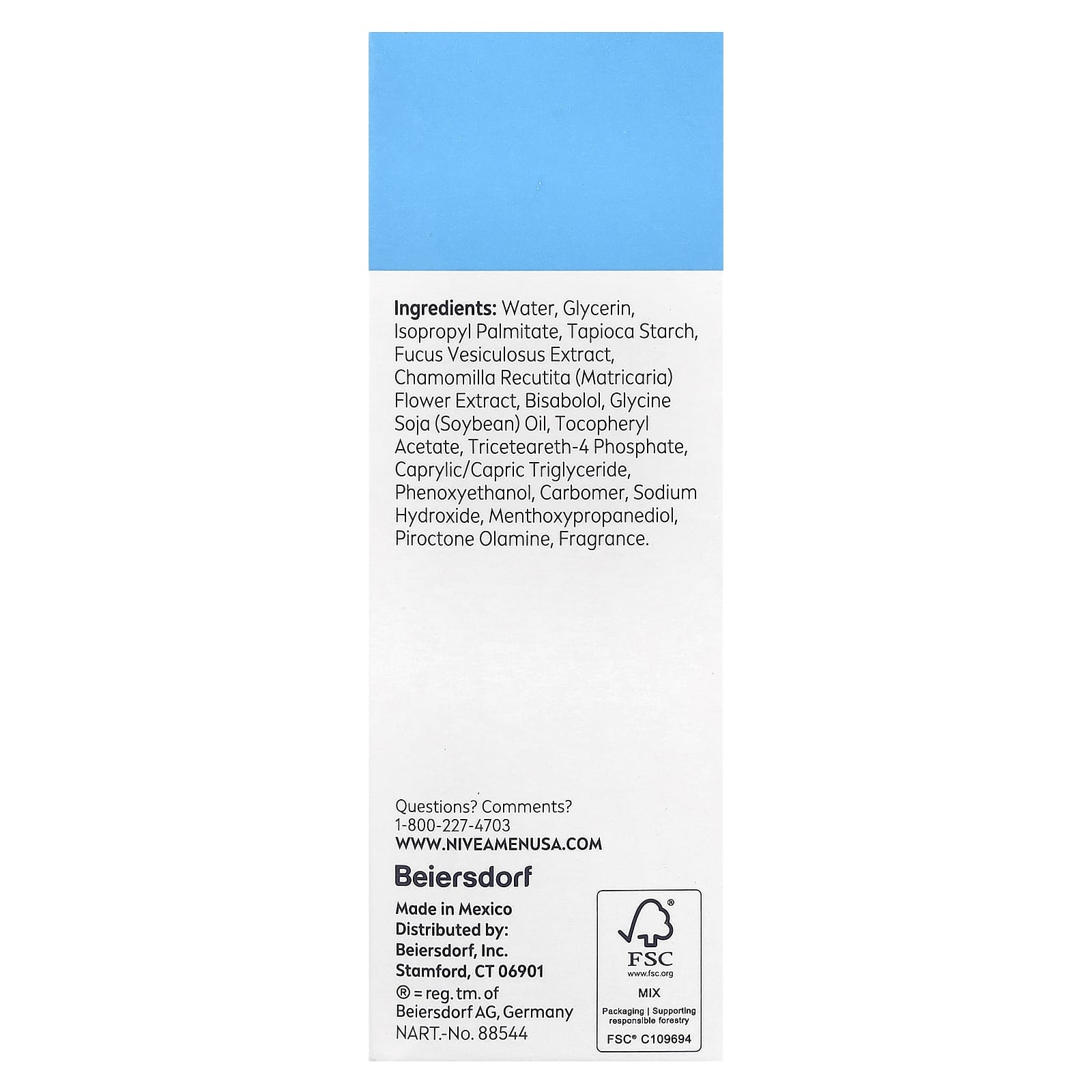 Água, glicerina, palmitato de isopropila, amido de tapioca, extrato de Fucus vesiculosus, extrato da flor de Chamomilla recutita (matricária), bisabolol, óleo de Glycine soja (soja), acetato de tocoferol, triceteareth-4 phosphate, caprylic/capric triglyceride, fenoxietanol, carbômero, hidróxido de sódio, menthoxypropanediol, piroctone olamine, fragrância.