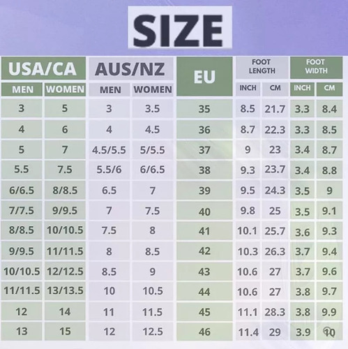 A lista de itens é do tamanho da EU, compre de acordo com o comprimento do seu pé em cm.