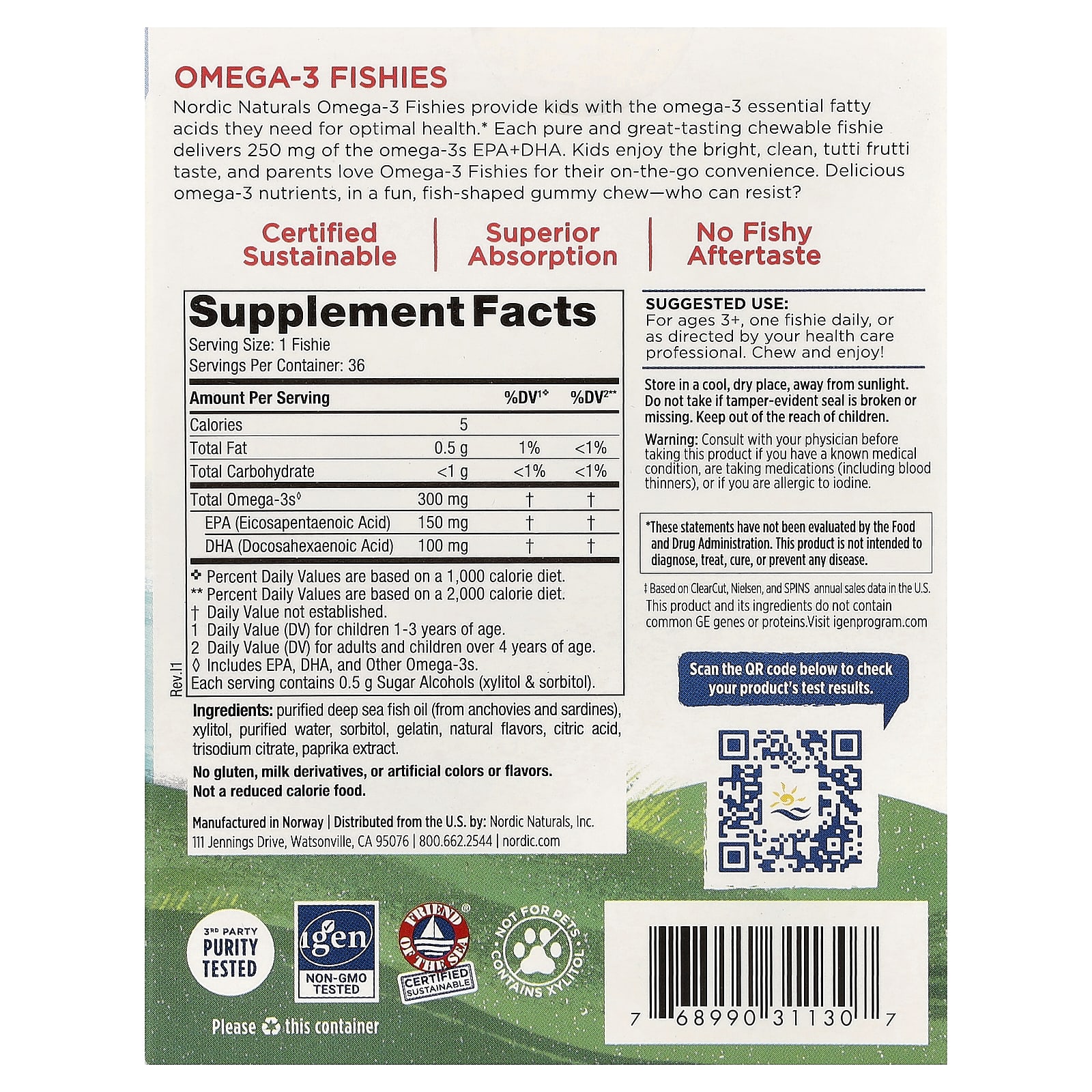 Omega-3 Fishies™ da Nordic Naturals fornece às crianças os ácidos graxos essenciais ômega-3 de que elas precisam para terem uma saúde ideal. Cada cápsula mastigável pura e saborosa em formato de peixinho fornece 250 mg de ômegas-3 EPA + DHA. As crianças amam o sabor intenso e puro de tutti-frutti; os pais adoram os Omega-3 Fishies da Nordic Naturals porque podem ser facilmente consumidos em qualquer lugar. Saborosos nutrientes de ômega-3 em uma goma divertida em formato de peixe. Quem pode resistir?