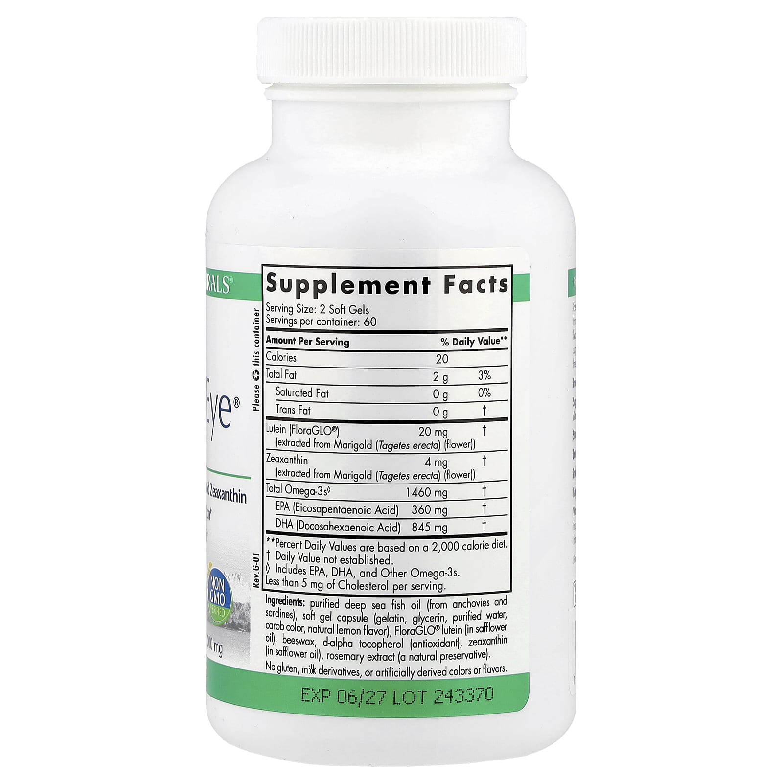 Óleo de peixe de águas profundas purificado (de anchovas e sardinhas), cápsula gelatinosa (gelatina, glicerina, água purificada, cor de alfarroba, sabor natural de limão), luteína floraGLO (no óleo de girassol), cera de abelha, d-alfa tocoferol, zeaxantina (no óleo de milho), extrato de alecrim (um conservante natural).