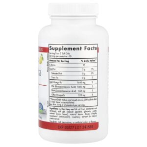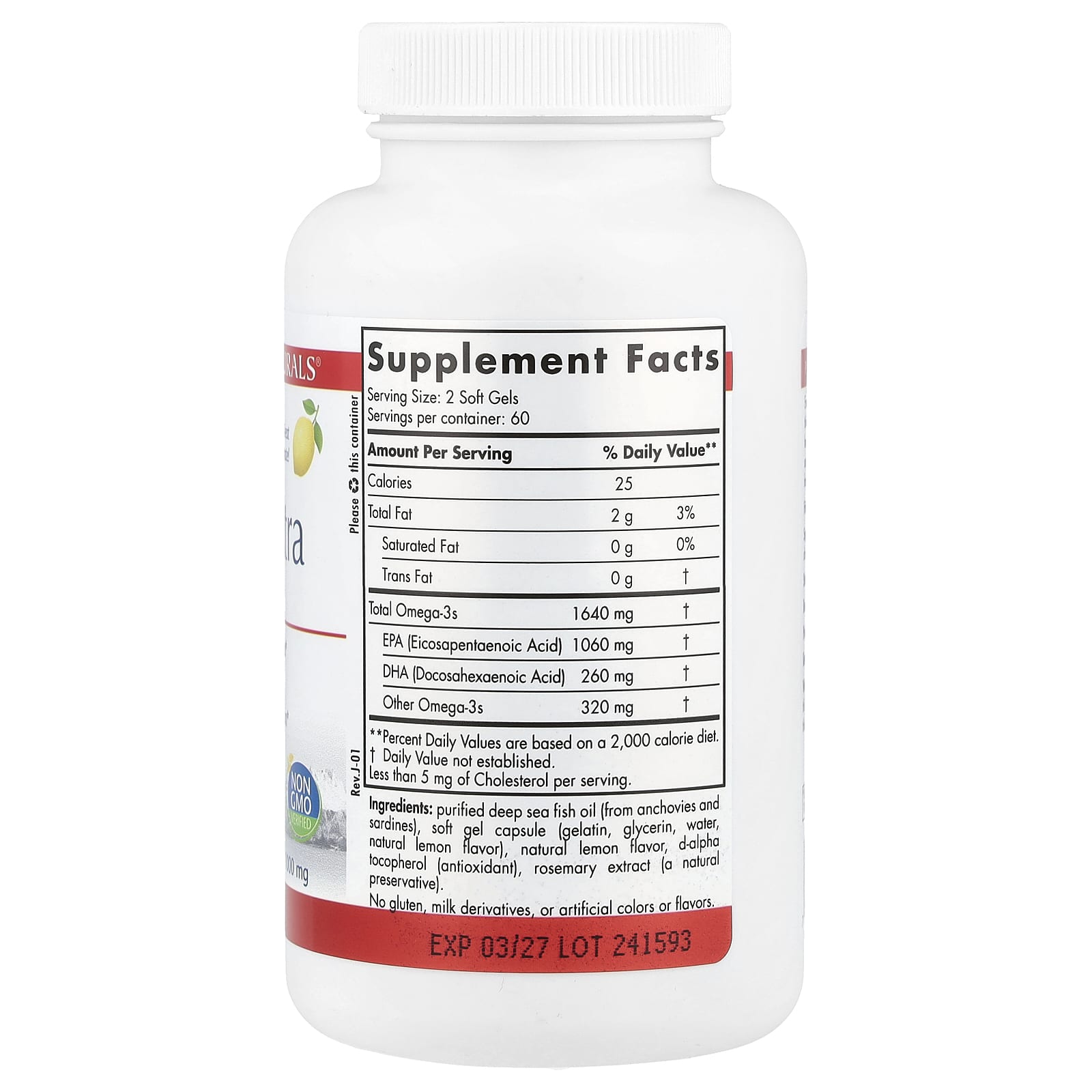Óleo de peixe de águas profundas purificado (de anchovas e sardinhas), cápsula softgel (gelatina, glicerina, água, sabor natural de limão), sabor natural de limão, dextroalfatocoferol (antioxidante), extrato de alecrim (um conservante natural).