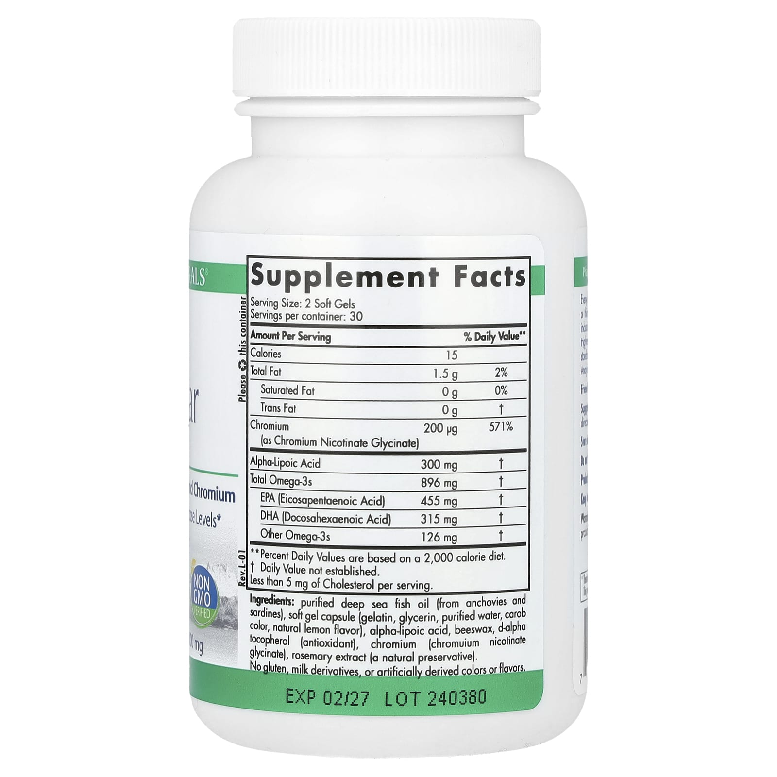 Óleo de peixe de águas profundas purificado (de anchovas e sardinhas), cápsula softgel (gelatina, glicerina, água purificada, corante de alfarroba, sabor natural de limão-siciliano), ácido tióctico, cera de abelha, dextroalfatocoferol (antioxidante), cromo (glicinato de nicotinato de cromo), extrato de alecrim (um conservante natural).
