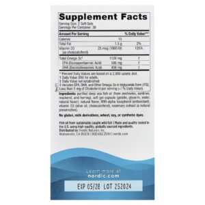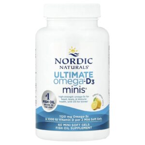 Os Minis Ultimate Omega®-D3^ contêm óleo de peixe ômega-3 da mais alta concentração na forma de triglicerídeos, oferecendo grandes benefícios em cápsulas softgel pequenas e fáceis de engolir. Os Ômega-3 ajudam a reforçar a saúde do coração e do cérebro, e a adição de vitamina D3 contribui para a função do sistema imunológico e ajuda a regular a absorção de cálcio para promover a saúde óssea.