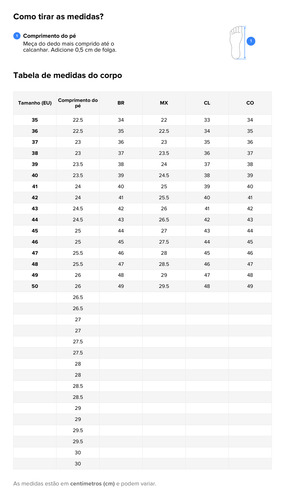 ### O tamanho do calçado é o tamanho padrão de calçados esportivos. Se você tem pés grandes ou peito do pé grosso, compre um tamanho maior.