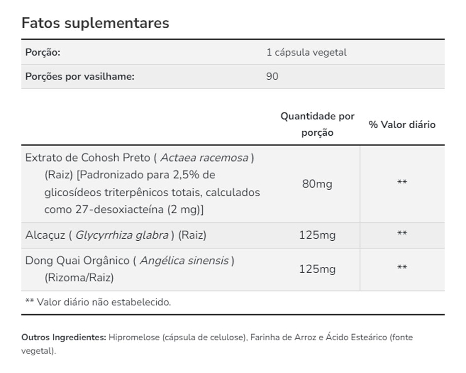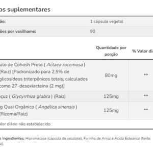 5. Composição Natural e Selecionada: Este suplemento é composto por Black Cohosh (Cimicifuga racemosa) de alta qualidade, conhecido por suas propriedades naturais. A dosagem de 80mg por cápsula foi cuidadosamente escolhida para fornecer uma abordagem eficiente e natural. VALIDADE LONGA