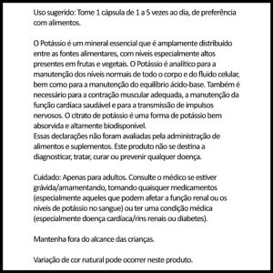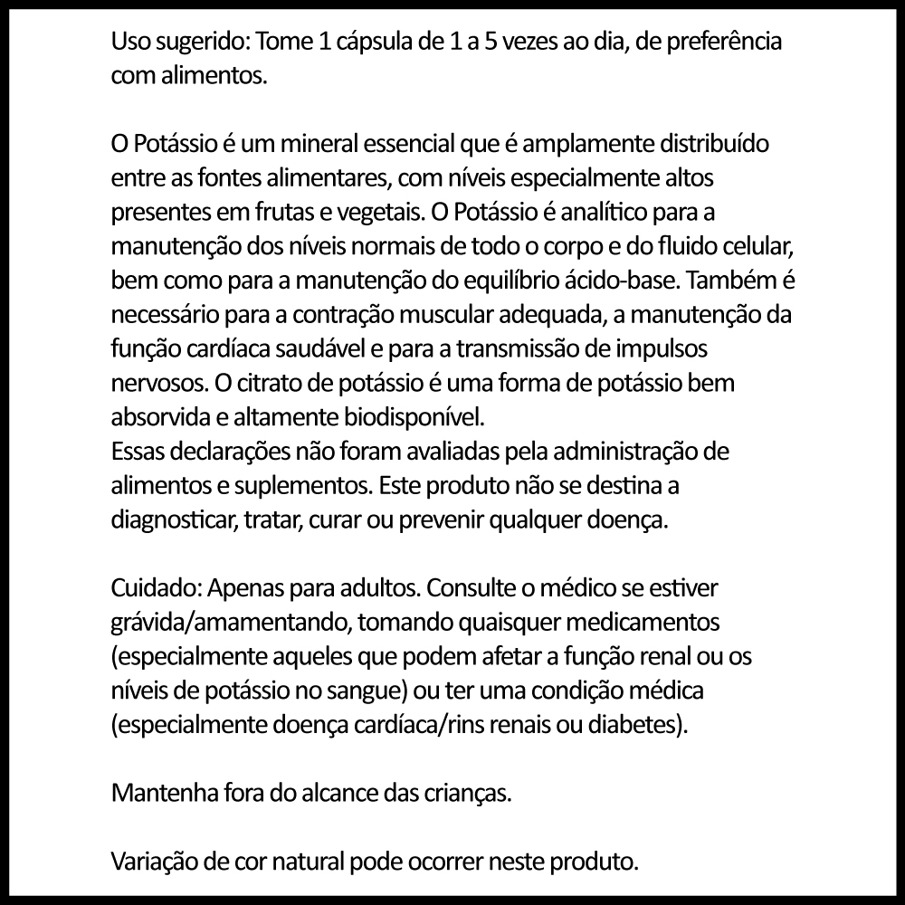 O potássio auxilia na manutenção do equilíbrio de fluidos e eletrólitos, na função muscular e no metabolismo de carboidratos e proteínas. Cada cápsula vegetal contém 99mg de potássio de citrato de potássio, sendo um produto adequado para vegetarianos e veganos;