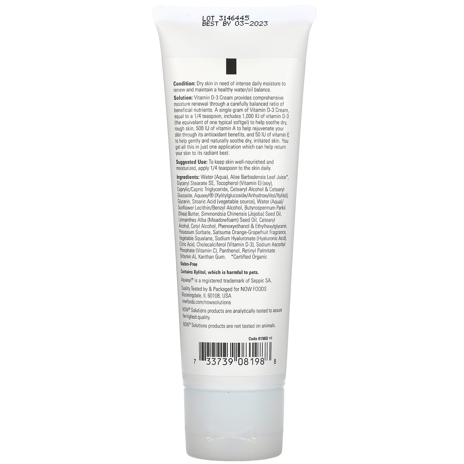Solução: o Creme de Vitamina D-3 oferece uma renovação hidratante abrangente por meio de uma proporção de nutrientes benéficos cuidadosamente balanceada. Um único grama do Creme de Vitamina D-3, equivalente a ¼ de uma colher de chá, inclui 1.000 UI de Vitamina D-3 (o equivalente a uma cápsula gelatinosa comum) para ajudar a acalmar a pele seca e áspera, 500 UI de Vitamina A para auxiliar no rejuvenescimento da pele por meio dos benefícios antioxidantes e 50 UI de Vitamina E para ajudar a acalmar suavemente e naturalmente a pele seca e irritada. Tudo isso em apenas uma aplicação que pode ajudar sua pele a ter novamente radiância.