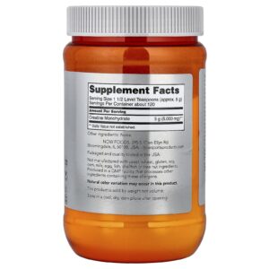 A creatina é um composto de ocorrência natural no corpo, principalmente no músculo esquelético.A função da creatina é servir como um precursor do trifosfato de adenosina (ATP), a forma de energia química usada por todas as células.Os estoques de creatina no corpo criam um estoque de ATP prontamente disponível para energia, o que é necessário para alimentar explosão rápidas de potência e força.Estudos demonstraram que a suplementação com creatina pode ajudar a manter o tecido muscular existente, promover o crescimento e o desenvolvimento de massa magra e promover o desempenho ideal durante sessões curtas de exercícios intensos.A Creatina Mono-hidratada da NOW® não tem aditivos nem conservantes.