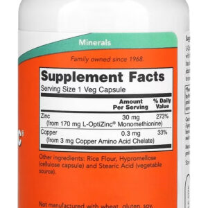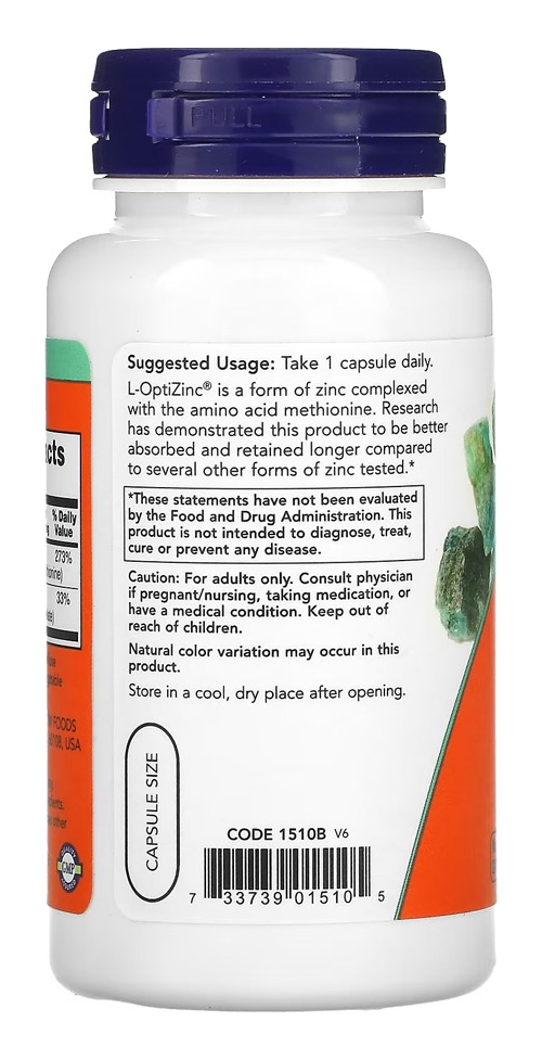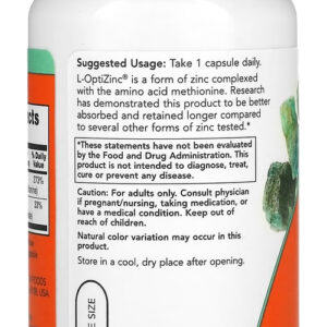 Now Foods L-OptiZinc 30mg 100 Veg Caps Suporte à Função Imunológica Ação Antioxidante / No Brasil O L-OptiZinc da Foods é uma forma de Complexo de Zinco composto de aminoácidos metionina que desempenha um papel em mais de 300 enzimas no organismo, sendo um composto essencial na melhora da função imunológica, ao mesmo tempo em que possui uma poderosa ação antioxidante. Disponível em cápsulas de 30mg que podem ser facilmente ingeridas, esta fórmula desenvolvida pela Now Foods pode ser usada para complementar sua dieta alimentar e fornecer as quantidades necessárias desta substância tão importante. Outros Ingredientes: Farinha de arroz, hipromelose (cápsula de celulose) e ácido esteárico (fonte vegetal). Recomendação de uso: Tome 1 cápsula por dia Cuidados: Apenas para uso por adultos. Busque orientação antes de utilizar este produto. Mantenha fora do alcance de crianças. Pode ocorrer variação natural da cor neste produto. Armazene em um local fresco e seco após abrir. Dimensões: 10,0 x 4,0 x 4,0 cm Peso: 0,074 Itens Inclusos: 1x Frasco com 100 Cap Veg VALIDADE LONGA.