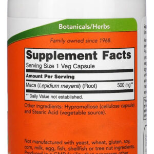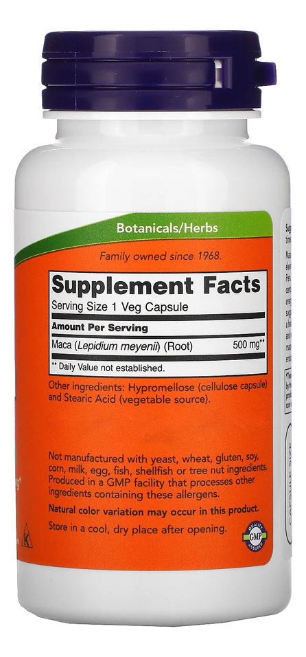 Now Foods Raw Maca Peruana 500mg 100 Cápsulas Vegetarianas para Homem e Mulher / Importado Disponível em uma fórmula de 500mg, bem como em cápsulas vegetarianas que podem ser facilmente ingeridas, a Maca Peruana da Now Foods apresenta uma forma mais concentrada e crua desta substância que pode ajudar a promover maior libido e desempenho sexual, vigor físico ou mesmo complementar sua dieta alimentar com as quantidades necessárias dessa substância importante que também funciona como tônico energético geral. Fabricado sem trigo, glúten, soja, milho, leite, ovo, peixe, marisco ou nozes. Outros ingredientes: Outros Ingredientes: Hipromelose (cápsula de celulose) e Ácido Esteárico (fonte vegetal). Recomendações de uso: Tomar 1 cápsula 1 a 3 vezes ao dia. Cuidados: Apenas para adultos. Pode ocorrer variação de cor natural neste produto. Mantenha fora do alcance de crianças. Armazenamento: Armazenar em local seco e fresco após a abertura. Podem ocorrer variações naturais de cor neste produto. Dimensões: 4,9 x 4,9 x 10,8 cm Peso: 0,090 1x Frasco com 100 Veg Caps Validade Longa
