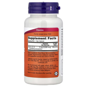 A Vitamina B-12 é necessária para a produção de energia a partir de gorduras e proteínas e é famosa por seu papel essencial na síntese de DNA, bem como no metabolismo da homocisteína. A mecobalamina é a forma de coenzima da vitamina B-12 que é especialmente importante na manutenção de um sistema nervoso saudável. As fontes alimentares são quase exclusivamente de origem animal (carne e laticínios) e a suplementação com B-12 pode ser especialmente importante para vegetarianos rigorosos. NOW® Methyl B-12 é vegetariano/vegano (não derivado de animais).