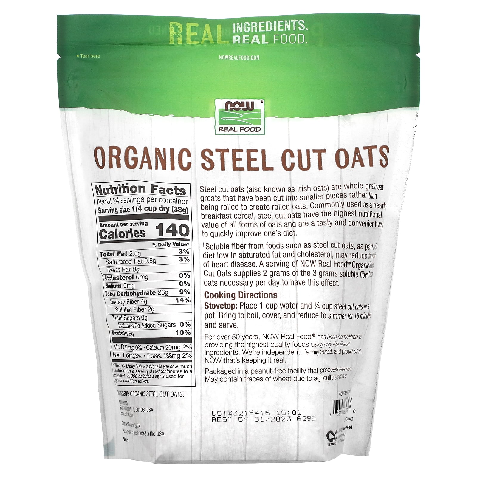 †A fibra solúvel de alimentos como a aveia cortada em aço, como parte de uma dieta com baixo teor de gordura saturada e colesterol, pode reduzir o risco de doenças cardíacas. Uma porção de Aveia Cortada em Aço Orgânica da NOW Real Food® fornece 2 dos 3 gramas de aveia em forma de fibra solúvel necessários por dia para atingir esse efeito.