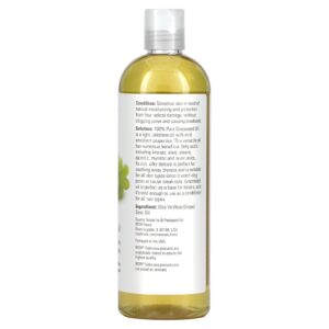 Solução: o Óleo de Semente de Uva 100% Puro é um óleo leve e inodoro com propriedades emolientes suaves. Este óleo versátil contém vários ácidos graxos benéficos, incluindo os ácidos linoleico, oleico, esteárico, palmítico, mirístico e láurico. Sua textura abundante e sedosa é perfeita para suavizar o ressecamento e é adequada para todos os tipos de pele, pois não obstrui os poros nem causa erupções cutâneas. O óleo de semente de uva é perfeito como base para loções e é suave o suficiente para ser usado como condicionador em todos os tipos de cabelo.