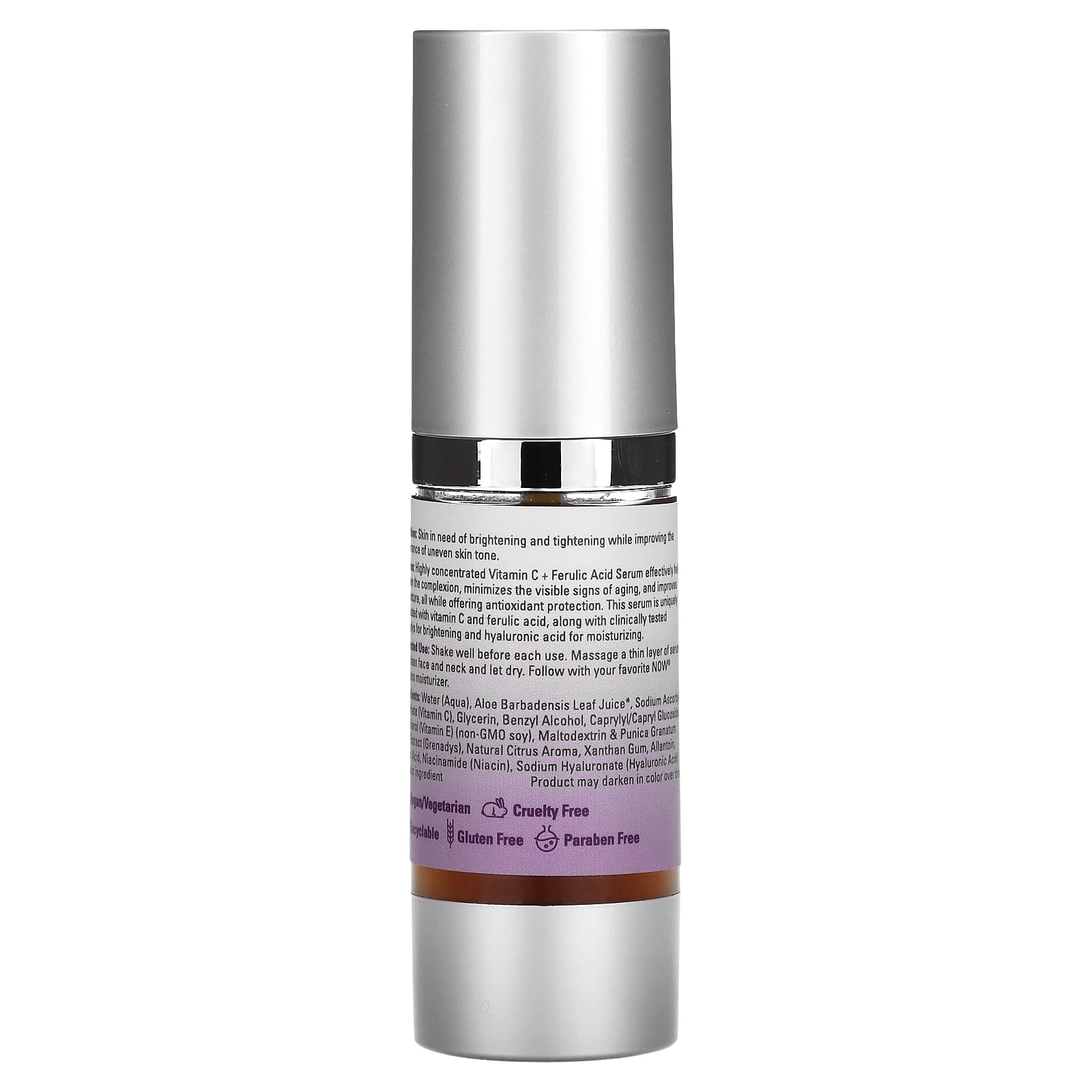 Agite antes de usar. Use uma fina camada de sérum para massagear rosto e pescoço limpos e deixe absorver. Em seguida, passe seu hidratante favorito da NOW® Solutions.