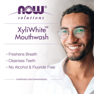 Solução: O enxaguante bucal NOW XyliWhite é um eficiente enxaguante bucal livre de fluoreto que funciona de maneira única para te ajudar a ter o sorriso mais branco e saudável do que nunca! O Enxaguante Bucal XyliWhite contém as propriedades do xilitol- um açúcar de álcool natural que mostrou em estudos clínicos que pode ajudar na saúde dental enxaguando com eficiência restos de comida da boca. O xilitol também ajuda a proteger o esmalte dentário. Para evitar a queda do pH da boca, o Enxaguante Bucal XyliWhite protege o esmalte dos dentes. Neem e Árvore do Chá proporcionam alívio delicado para quem precisa de mais assistências de cuidados orais.