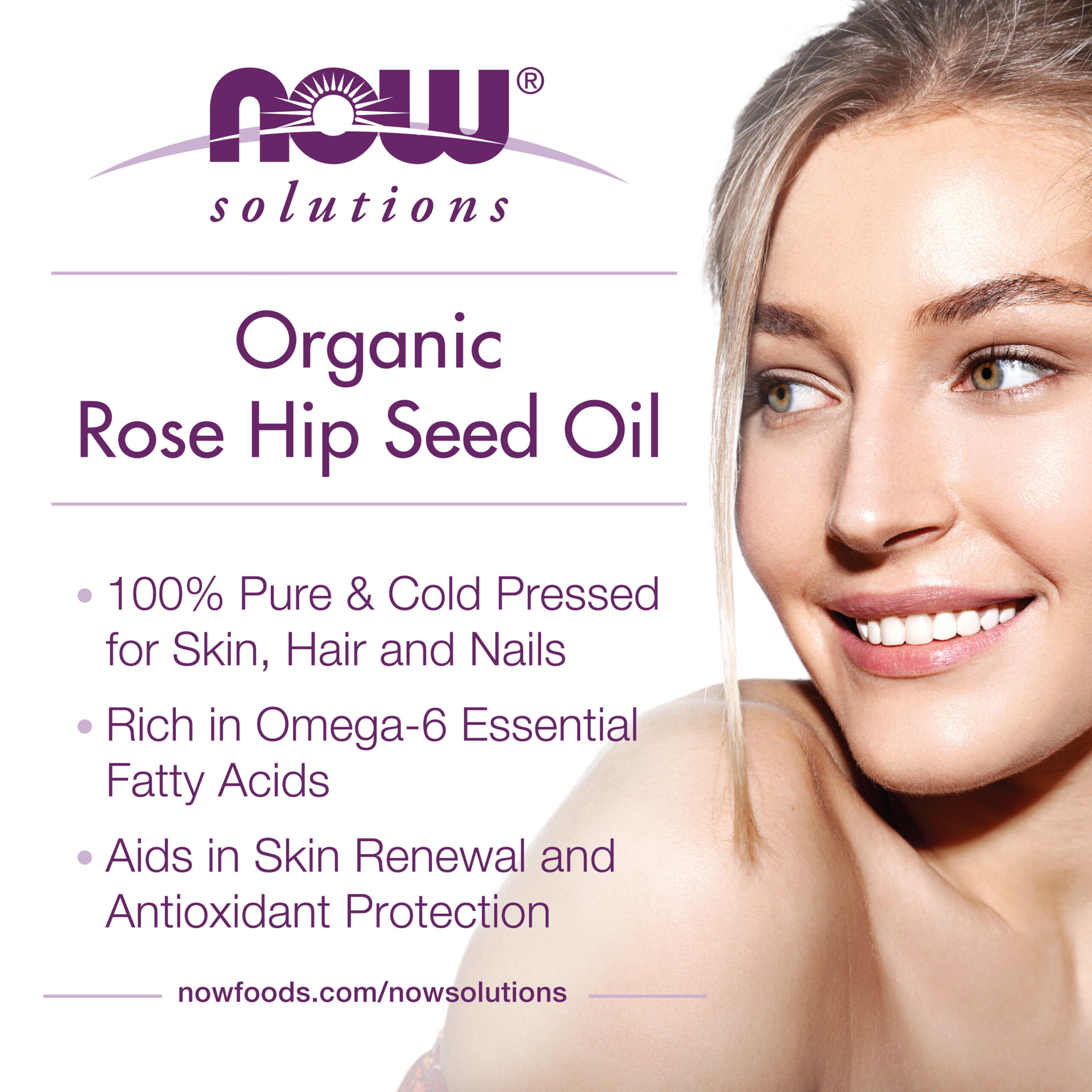 Solução: extraído das sementes de Rosa-Mosqueta, o Óleo Puro da Semente de Rosa-Mosqueta é rico em ácidos graxos essenciais Ômega-6. Este óleo pode ser usado para ajudar na renovação da pele para promover um brilho saudável e para proteção antioxidante.