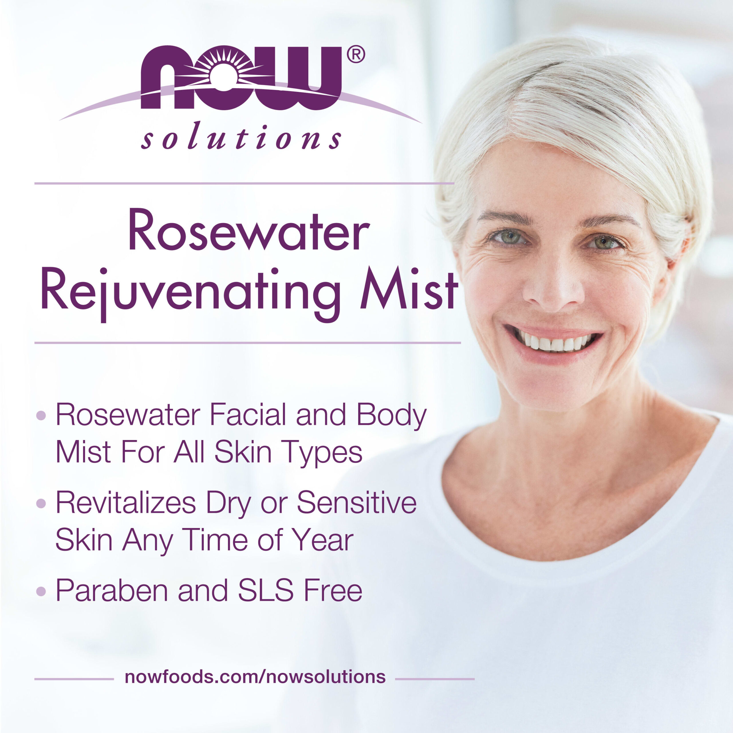 Solução: Com um perfume floral delicado e atraente, o Spray Rejuvenescedor de Água de Rosas é uma solução refrescante calmante e multiuso que hidrata e revitaliza instantaneamente a pele seca ou sensível em qualquer época do ano.