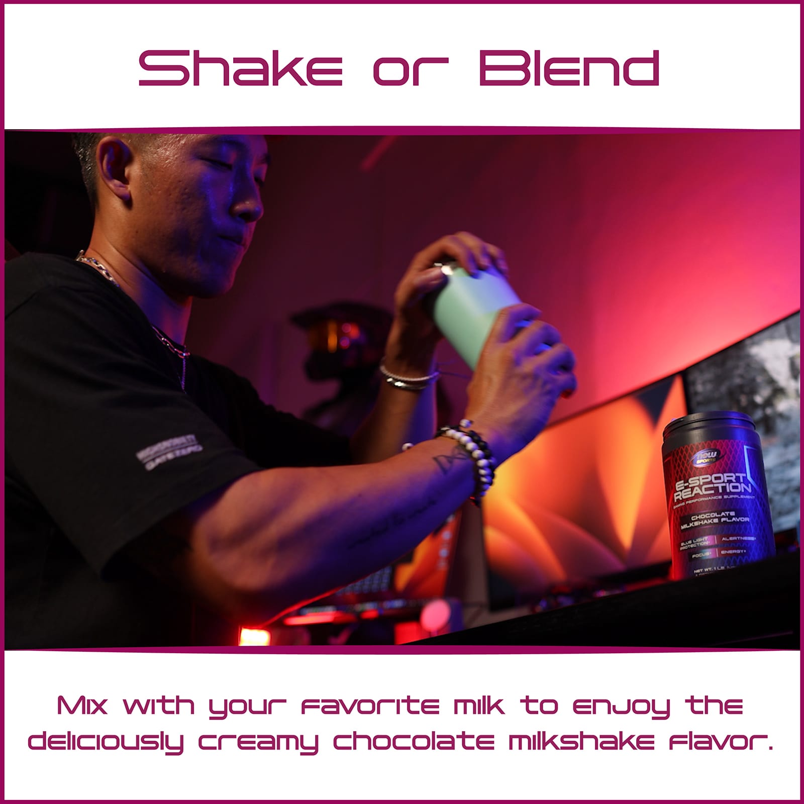 Pó E-Sport Reation da NOW® Sports, seu aliado definitivo para jogar! Este suplemento com sabor de milkshake de chocolate aumenta o foco e o desempenho para manter você competitivo e energizado durante maratonas de jogos. Pronto para passar de nível?