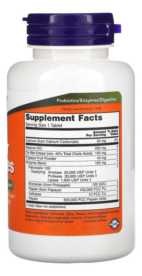 Now Foods Super Enzymes Enzimas Digestivas 90 Tablets / No Brasil   A Super Enzymes da Now Foods é uma mistura abrangente de enzimas digestivas que apoiam uma digestão positiva. Apresenta uma fórmula com compostos como bromelaína, pancreatina, papaína, dentre outras substâncias que auxiliam na  quebra de gorduras, carboidratos e proteínas e facilitam sua absorção de pelo organismo a partir do intestino, o que por sua vez, possibilita um melhor usufruto dos nutrientes ingeridos. Apenas um tablet por dia junto a uma refeição e você desfrutará de todos os benefícios da Super Enzymes.   Outros ingredientes:   celulose, sílica, ácido esteárico (fonte vegetal), estearato de magnésio (fonte vegetal), croscarmelose sódica e esmalte farmacêutico. Contém sulfitos.   Fabricado sem trigo, glúten, soja, leite, ovo, peixe, marisco ou ingredientes de nozes.    Recomendações de uso: Tome 1 Tablet ou comprimido com uma refeição.   Cuidados: Apenas para adultos. Busque orientação antes de utilizar este produto se estiver grávida ou amamentando. Mantenha fora do alcance de crianças.   Armazenamento: Armazenar em local seco e fresco após a abertura.   Conteúdo do frasco: 1x Frasco com 90 Tablets   VIDE VALIDADE