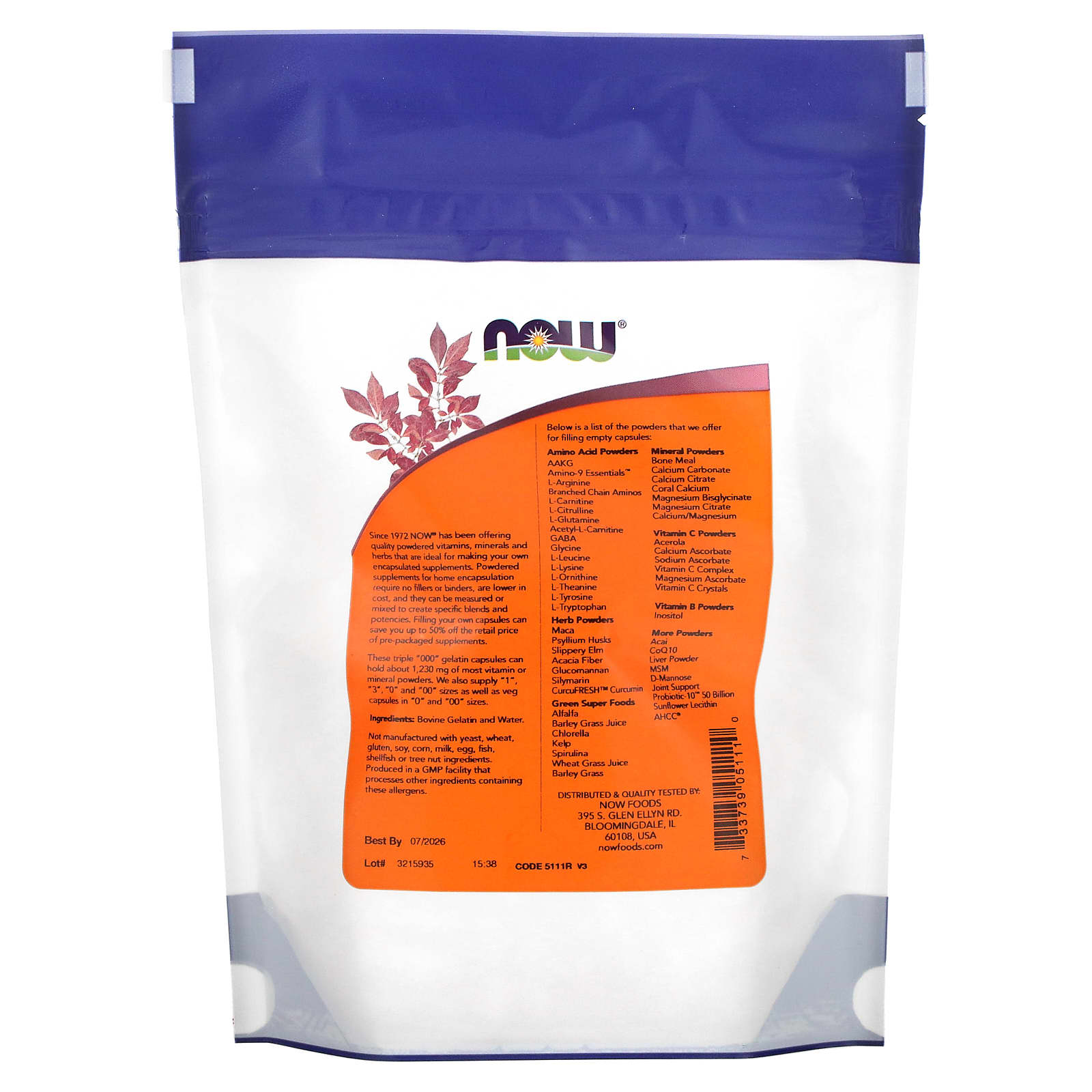 Desde 1972, a NOW® oferece vitaminas em pó de qualidade, minerais e ervas ideais para fazer seus próprios suplementos encapsulados. Os suplementos em pó para encapsulamento doméstico não requerem excipientes ou aglutinantes, têm custo mais baixo e podem ser medidos ou misturados para criar misturas e potências específicas. Encher suas próprias cápsulas pode economizar até 50% do preço de varejo de suplementos pré-embalados.
