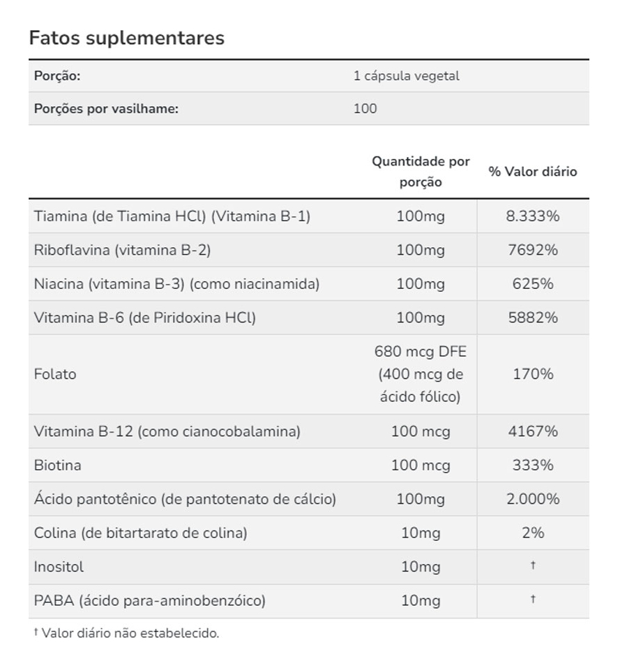5. Composição Rica e Pura: Este suplemento é composto por um espectro completo de vitaminas B, incluindo B1, B2, B3, B6, B12, ácido fólico, biotina e ácido pantotênico. Livre de ingredientes artificiais, o Complexo B-100 é uma escolha pura e eficaz para o seu dia a dia. VALIDADE LONGA