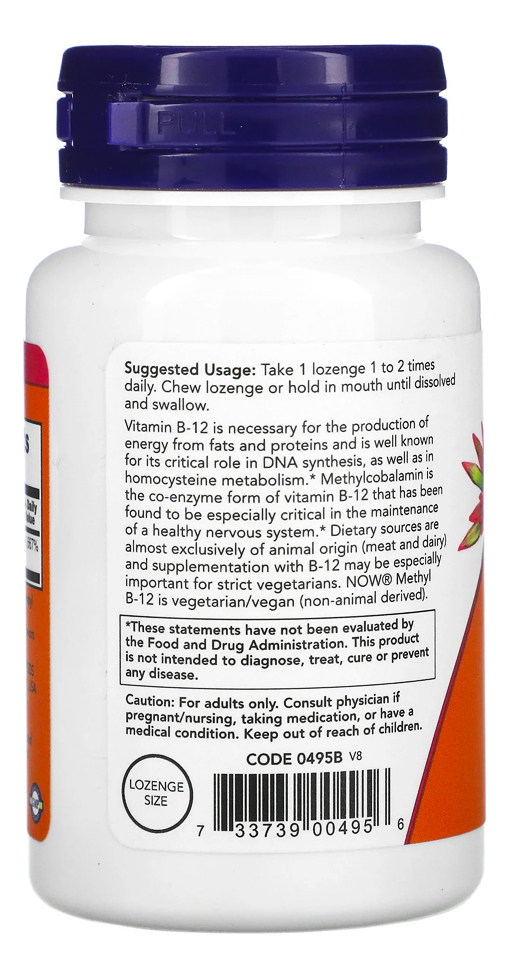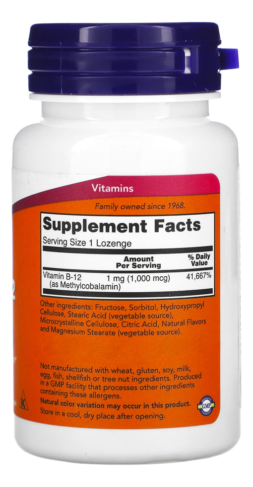 Now Foods Vitamina B-12 1mg com Metilcobalamina 100 Pastilhas / Importado A vitamina B-12 é uma substância essencial e necessária para a produção de energia, sendo também conhecida por seu papel importante na síntese de Ácido Desoxirribonucleico e no metabolismo da homocisteína. A Metilcobalamina é a forma coenzimática da vitamina B-12 que tem sido considerada especialmente crítica para dar suporte ao bem-estar. Com esta fórmula desenvolvida pela Now Foods, você pode complementar facilmente sua dieta alimentar com as quantidades necessárias desta substância juntamente com metilcobalamina, que é fundamental para a conversão de homocisteína em metionina. Fabricado sem trigo, glúten, soja, leite, ovo, peixe, marisco ou nozes. Outros Ingredientes: Frutose, Sorbitol, Hidroxipropilcelulose, Ácido Esteárico (fonte vegetal), Celulose Microcristalina, Ácido Cítrico, Sabores Naturais e Estearato de Magnésio (fonte vegetal). Recomendações de uso: Tome 1 pastilha 1 a 2 vezes ao dia. Mastigue a pastilha ou segure na boca até dissolver e engula. Cuidados: Apenas para adultos. Busque orientação se estiver grávida ou amamentando. Mantenha fora do alcance de crianças. Pode ocorrer variação de cor natural neste produto. Armazenar em local fresco e seco após a abertura. Dimensões: 4,6 x 4,6 x 8,9 cm Peso: 0,056 1x frasco com 100 Pastilhas Validade Longa