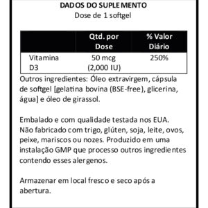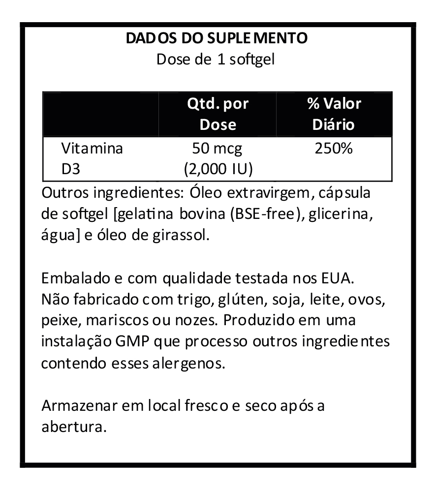 Disponível em cápsulas de softgels líquidas de rápida absorção e fórmula de alta potência de 2.000 IU, a Vitamina D3 da Now Foods é a escolha certa para complementar sua dieta alimentar com as quantidades necessárias desta substância que apresenta suporte indispensável a mineralização óssea, bem-estar e fortalecimento do organismo, uma vez que atua não somente nos processos de multiplicação e diferenciação celular, mas também auxiliando na absorção de cálcio e fósforos pelo corpo, substâncias importantes para o crescimento ósseo. Uma dose por dia é tudo que você irá precisar. OUTROS INGREDIENTES: Azeite Virgem Extra e Cápsula Softgel (gelatina bovina, glicerina, água). Fabricado sem fermento, trigo, glúten, soja, milho, leite, ovo, peixe ou ingredientes de marisco. RECOMENDAÇÕES DE USO: Tome 1 cápsula de softgels diariamente com uma refeição CUIDADOS: Apenas para adultos. Busque orientação antes de utilizar este produto se estiver grávida ou amamentando. Mantenha fora do alcance de crianças ARMAZENAMENTO: Armazenar em local seco e fresco após a abertura. Pode ocorrer variação natural da cor neste produto. CONTEÚDO DO FRASCO: 120 Softgels Validade Longa