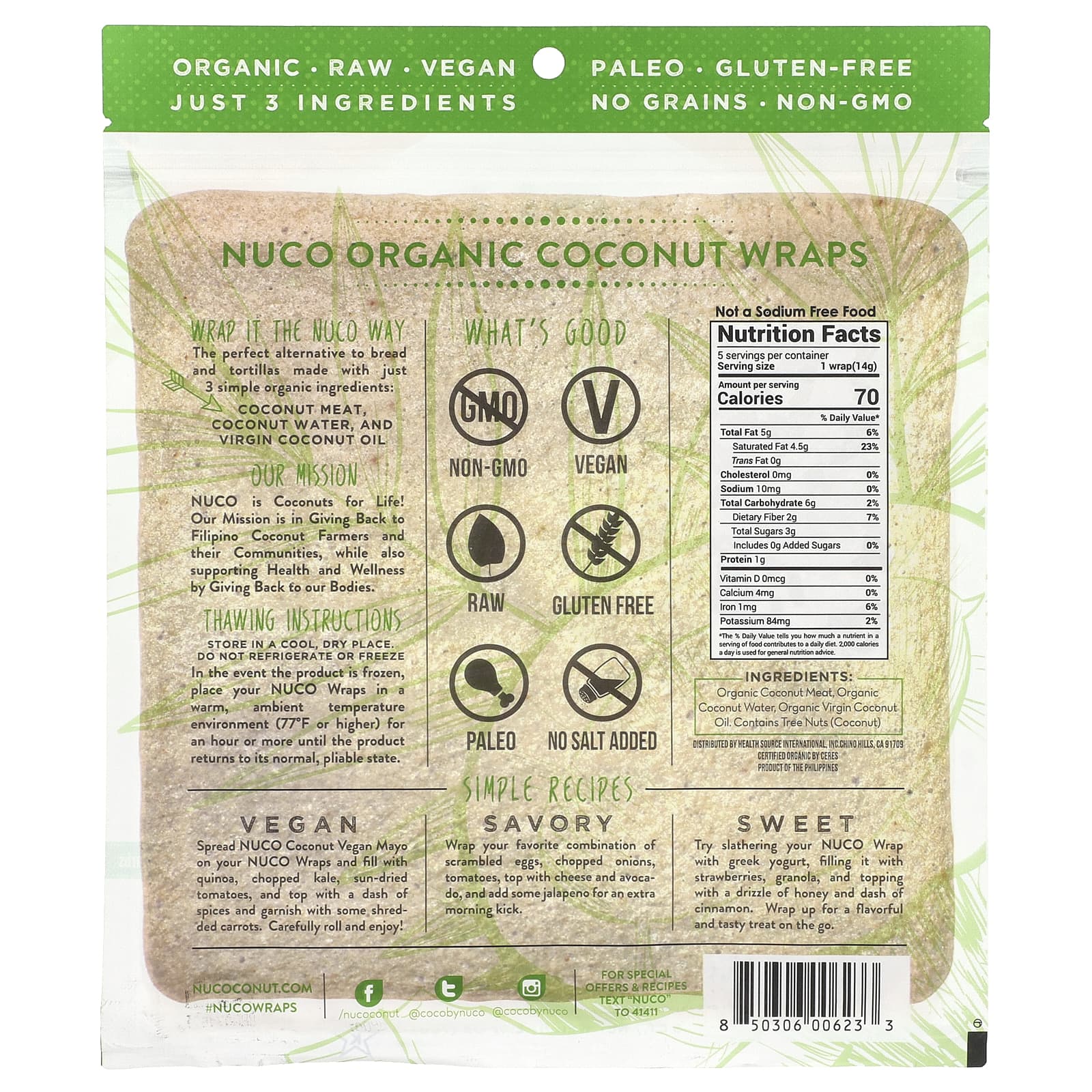 NUCO Wraps de Coco Orgânico Original 5 Wraps (14 g) Cada – NUCO Alimentos Alimentos embalados e prontos Pães e Wraps.