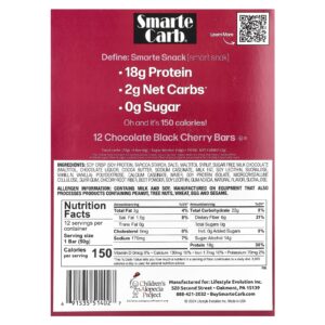 Smarte Nutrition – com uma cereja no topo. Experimente uma barra de proteína Smarte Carb com baixo teor de carboidratos em Cereja Negra com Chocolate para uma guloseima indulgente e sem culpa. Essas barras contêm 0 g de açúcar e 18 g de proteína, uma escolha deliciosa para pessoas com restrições alimentares.