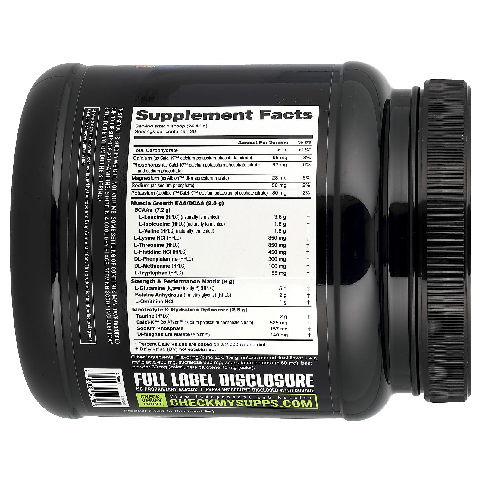 | EAA/BCAA para Crescimento Muscular (9,8 g) BCAAs (7,2 g) L-Leucina (HPLC) (fermentada naturalmente) L-Isoleucina (HPLC) (fermentada naturalmente) Levovalina (HPLC) (fermentada naturalmente) Cloridrato de L-lisina (HPLC) L-Treonina (HPLC) Cloridrato de L-Histidina (HPLC) DL-Fenilalanina (HPLC) DL-Metionina (HPLC) Triptofano (HPLC) |