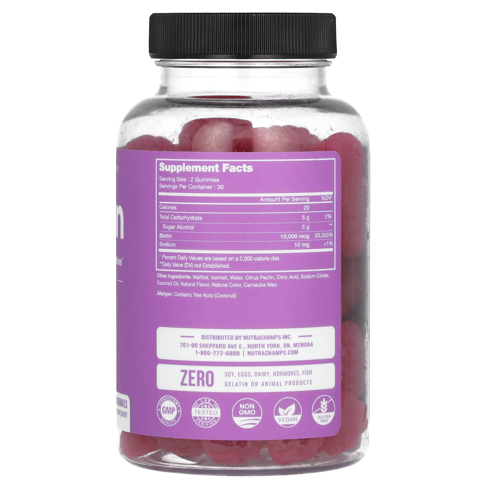 Cuidar do cabelo, da pele e das unhas não é apenas o tipo de produto que você usa por fora, mas também os nutrientes que você ingere no interior do corpo. As Gomas de Biotina NutraChamps ajudam a tratar uma deficiência interna de vitaminas para que você possa ter unhas fortes, pele firme e radiante e cabelos espessos, cheios e saudáveis. Desfrute de todos os benefícios incríveis da biotina na forma de uma goma prática e saborosa, sem comprimidos difíceis de engolir.
