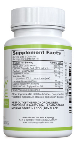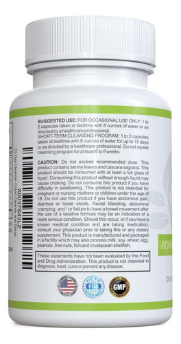 cólon de 15 dias para melhorar a saúde intestinal. Este programa de curto prazo consiste em tomar 1 a 2 cápsulas antes de dormir com 8 onças de água, por até 15 dias, ou conforme indicado por um profissional de saúde. Não repita o programa de limpeza por pelo menos 6 a 8 semanas. Ajuda a promover a perda natural de resíduos e reduz o inchaço, proporcionando uma sensação de leveza e maior energia. Promove movimentos intestinais saudáveis e regulares, eliminando o acúmulo no intestino e limpando toxinas e resíduos do corpo. Fórmula não transgênica, fabricada nos Brasil em uma instalação inspecionada pela FDA seguindo rígidos padrões de Boas Práticas de Fabricação (GMP). Contém laxantes naturais à base de plantas, como pó de casca de psyllium, folha de senna e pó de linhaça.