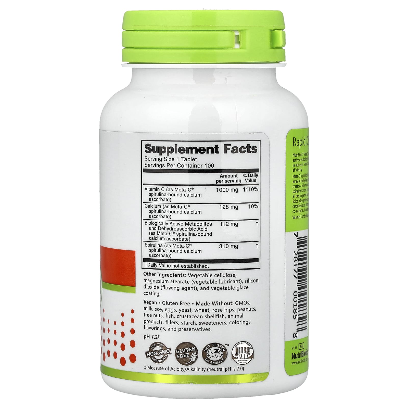 Meta-C® da NutriBiotic® é uma vitamina C tamponada exclusiva com metabólitos biologicamente ativos da espirulina, uma alga verde-azulada unicelular rica em nutrientes. Os Comprimidos Meta-C se dissolvem rapidamente e são absorvidos com rapidez e eficiência.