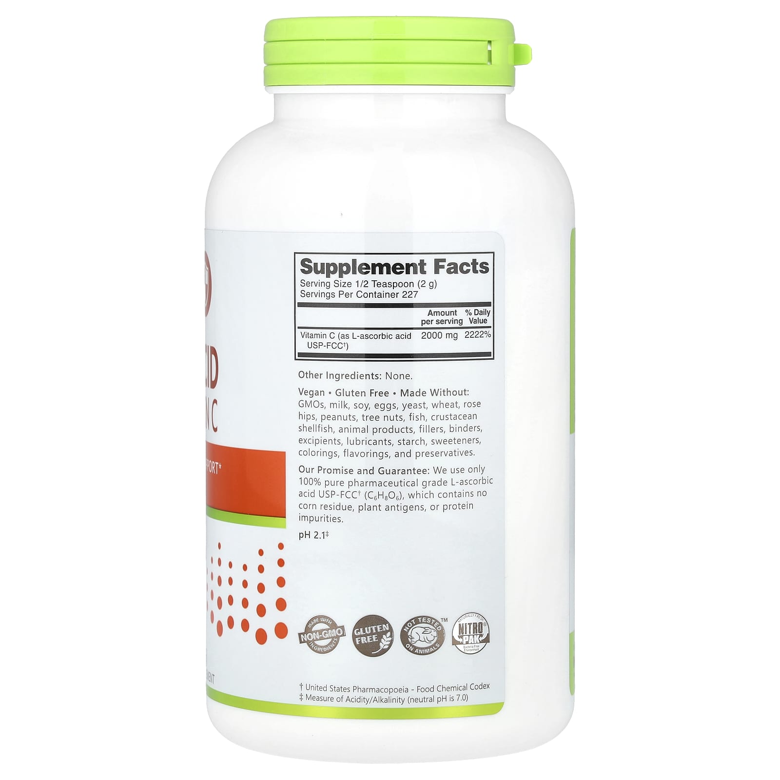 Nossa promessa e garantia: Usamos apenas ácido ascórbico 100% puro de classe farmacêutica USP-FCC† (C6H8O6), que não contém resíduos de milho, antígenos de plantas, ou impurezas de proteínas.