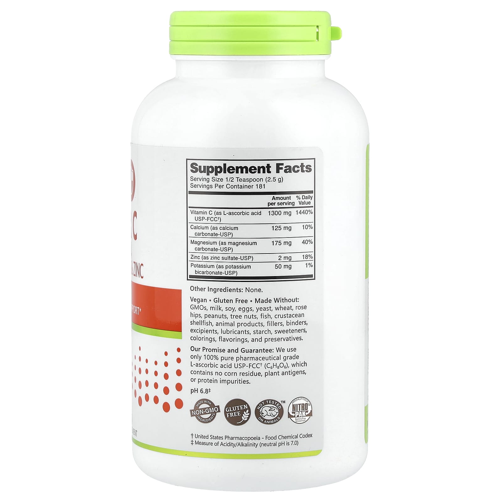 Nossa Promessa e Garantia: Usamos apenas ácido ascórbico 100% puro de classe farmacêutica USP-FCC† (C6H806), que não contém resíduos de milho, antígenos de plantas, ou impurezas de proteínas.