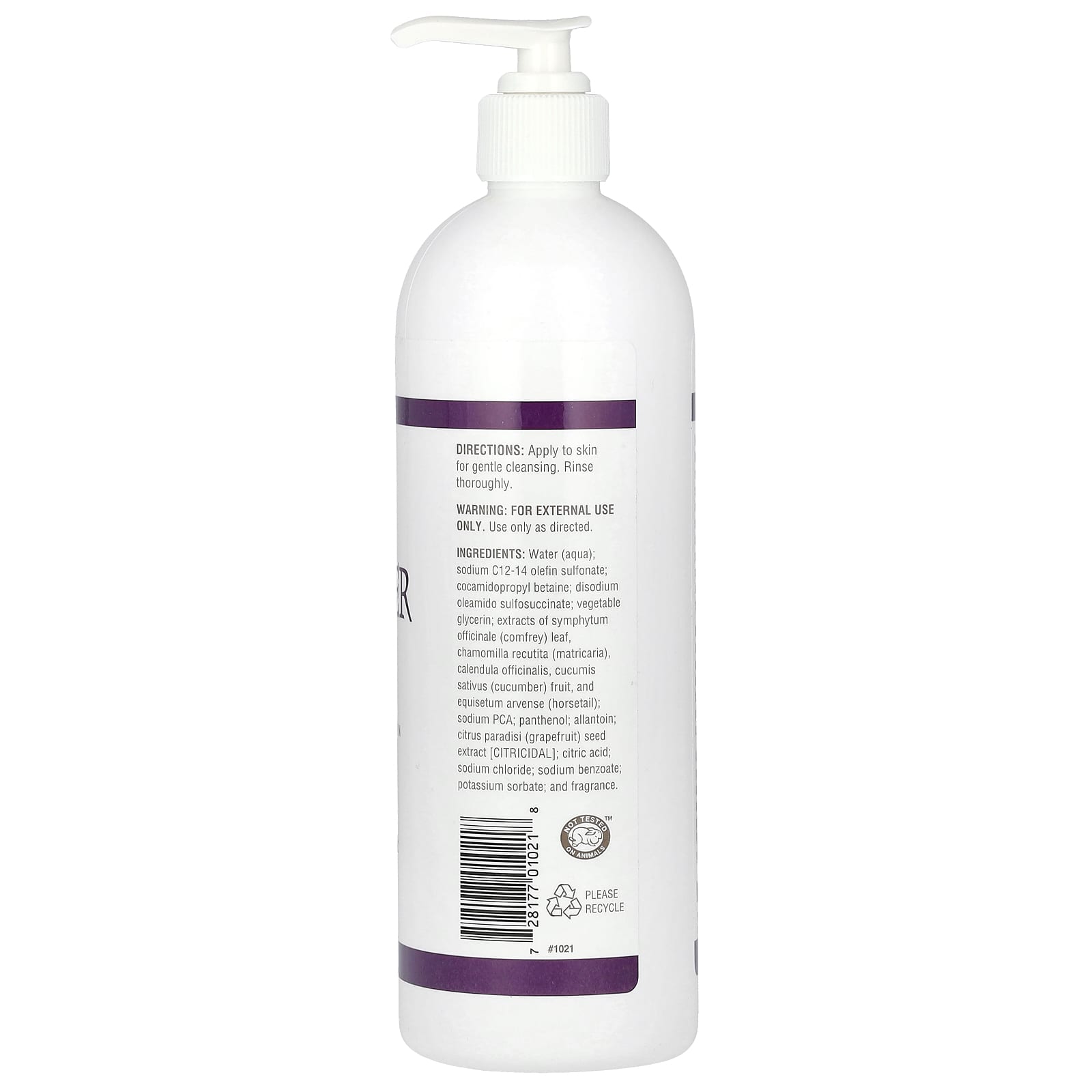 Água (aqua); sulfonato de olefina C14-16 sódio; cocoamidopropilbetaína, oleamido sulfosuccinato dissódico, glicerina vegetal, extratos da folha do Symphytum officinale (confrei), Chamomilla recutita (matricária), Calendula officinalis, fruto de Cucumis sativus (pepino), e Equisetum arvense (cavalinha); sódio PCA; pantenol; alantoína; extrato da semente de Citrus paradisi (toranja) [citricidal]; ácido cítrico; cloreto de sódio, benzoato de sódio, sorbato de potássio, e fragrância.
