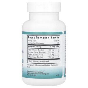 Uma mistura de tecidos glandulares, incluindo tecido adrenal, pâncreas, timo e baço. Nosso material glandular natural é derivado de animais criados soltos e inspecionados pelo governo, criados na Nova Zelândia e na Austrália, cujas regulamentações de produção animal estão entre as mais rígidas do mundo. O material é liofilizado, o que significa que é imediatamente congelado e, em seguida, submetido a um alto vácuo que vaporiza a umidade diretamente do estado sólido.