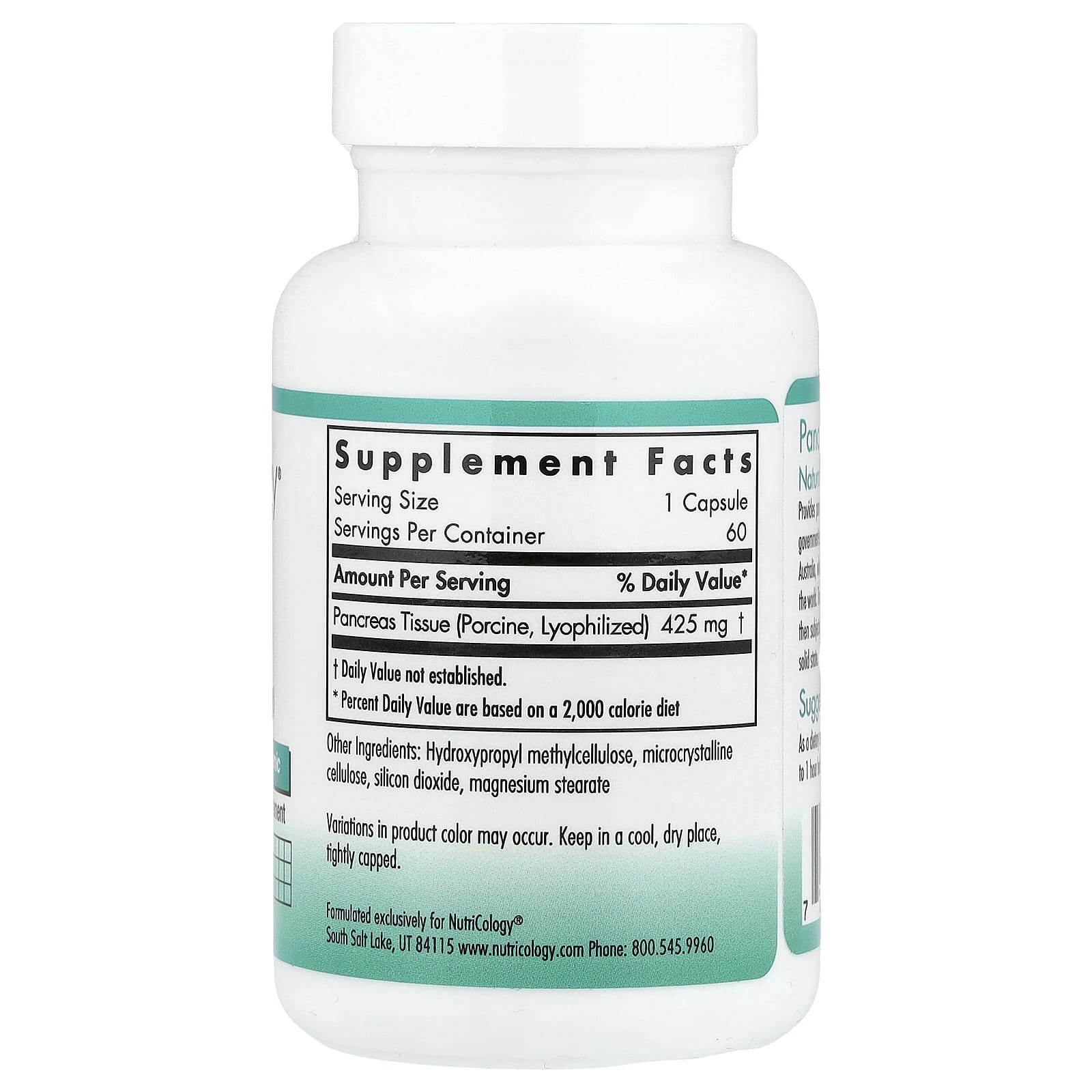 Nutricology Pâncreas Glandular e Natural (Carne de Porco) 60 Cápsulas (425 mg por cápsula) – Nutricology Suplementos Suplementos de órgãos animais Saúde Intestinal.