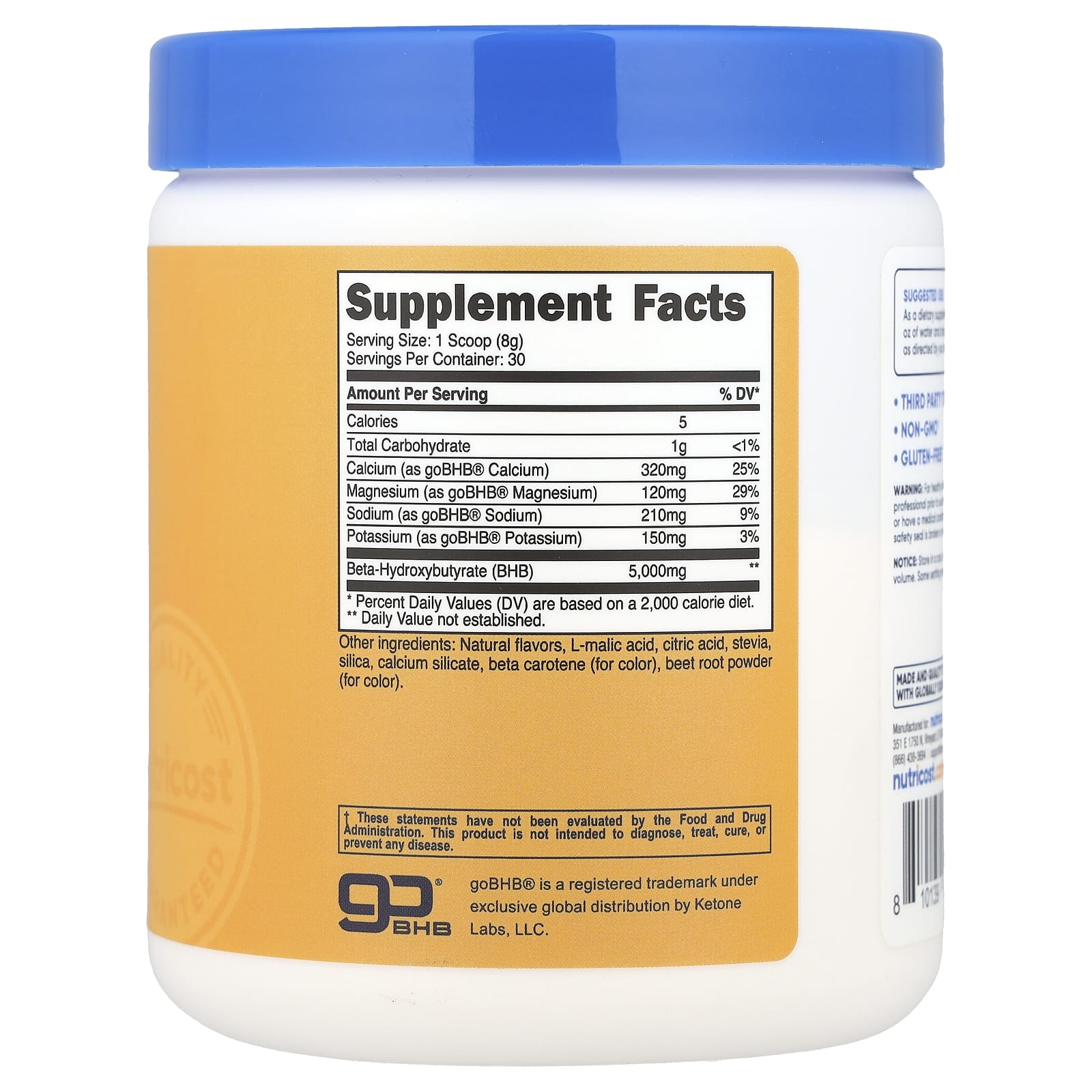 Nutricost BHB Salts goBHB® Pêssego e Manga 249 g (89 oz) – Nutricost Nutrição Esportiva Suplementos para Recuperação Muscular BHB.